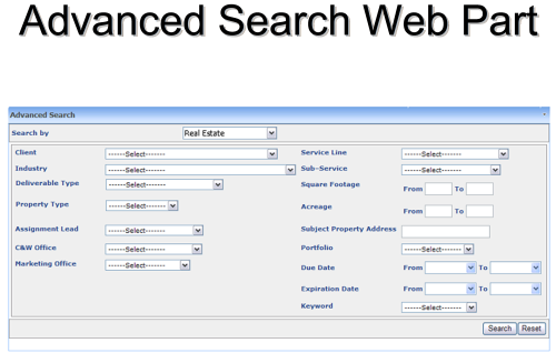 The first challenge we needed to resolve was the metadata search on the different document types. After that we needed to do something about the advanced search. The easy solution was to have a custom webpart written to handle the search. Given all the other criteria of their requirements we didn’t have time to push SharePoint aside and do a custom web application. Ninety percent of the functionality was there in SharePoint already that’s why we decided to just do custom webparts.